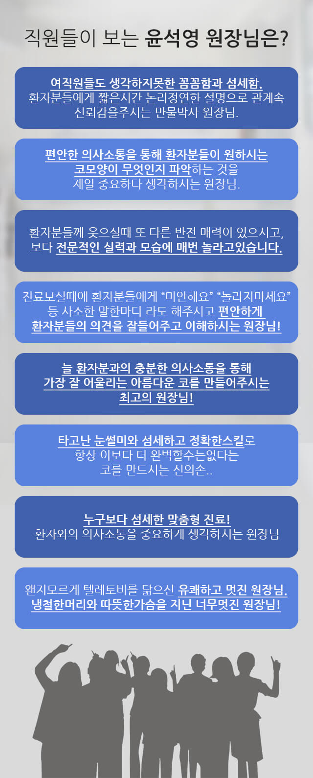 원장님의 보고 또 보는 버릇은 아마 환자의 최상의 만족을 얻게 해주려는 노력에서 온 거 아닐까 생각해요.